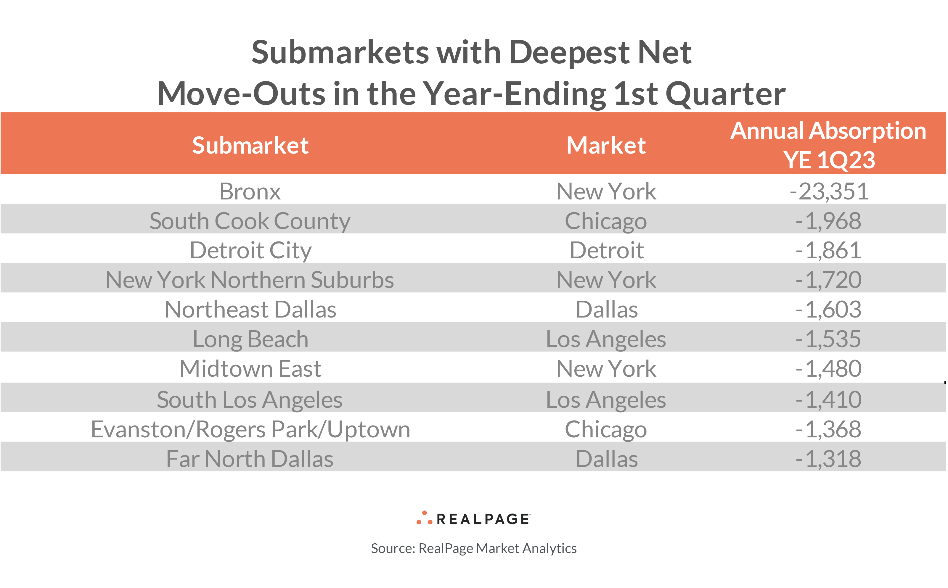 Driving vacancies across these markets were at least 10 of the 213 submarkets in the group. Submarket-level performance revealed a mixed-story – both urban and suburban. In the year-ending 1st quarter 2023, the Bronx (-23,351 units) submarket drove subpar performance in New York. Two other New York submarkets also hit the list: New York Northern Suburbs (-1,720 units) and Midtown East (-1,480 units).