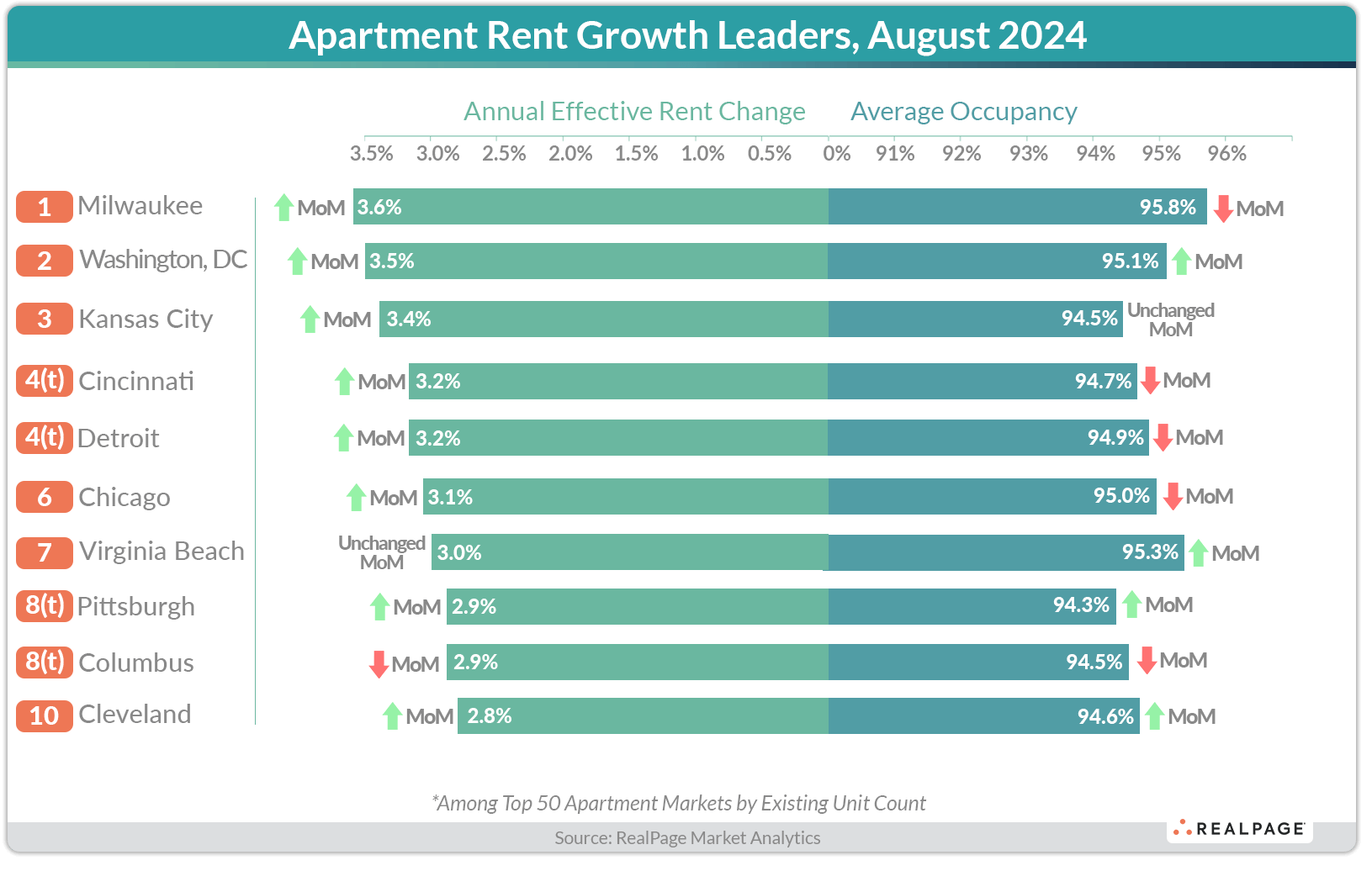 The Midwest and Northeast remained the nation’s best rent growth performers, with prices growing 2.9% and 2.7%, respectively, in the year-ending August. Among the nation’s 50 largest apartment markets, leading the charge for rent growth in the past year were Milwaukee, Washington, DC and Kansas City, where price increases were between 3.4% and 3.6%.
