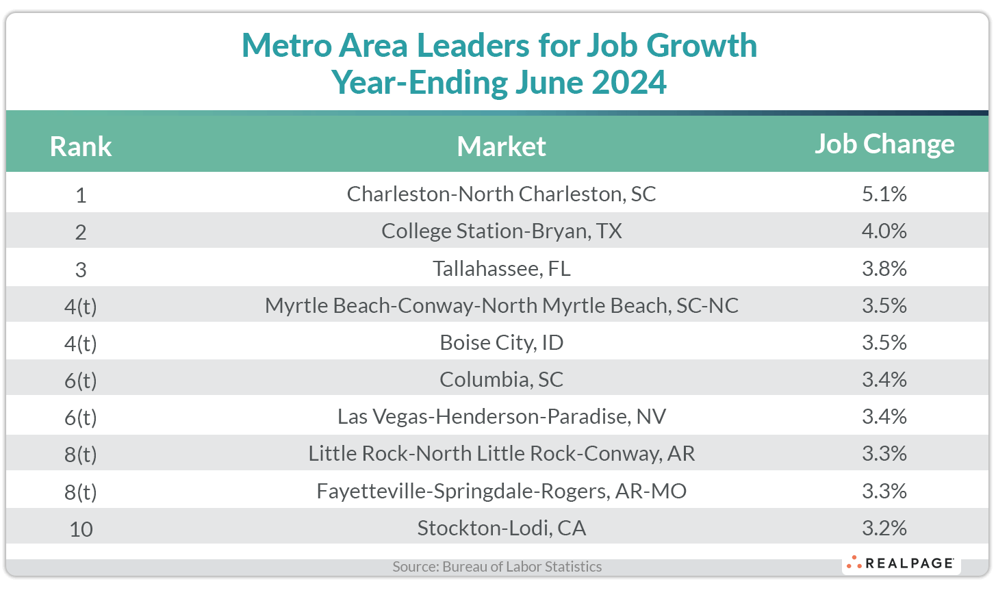 Charleston ranked #1 for employment change in June at 5.1%, up 60 basis points (bps) from May, while College Station, TX remained in the #2 spot with a 4% growth rate, unchanged from May.