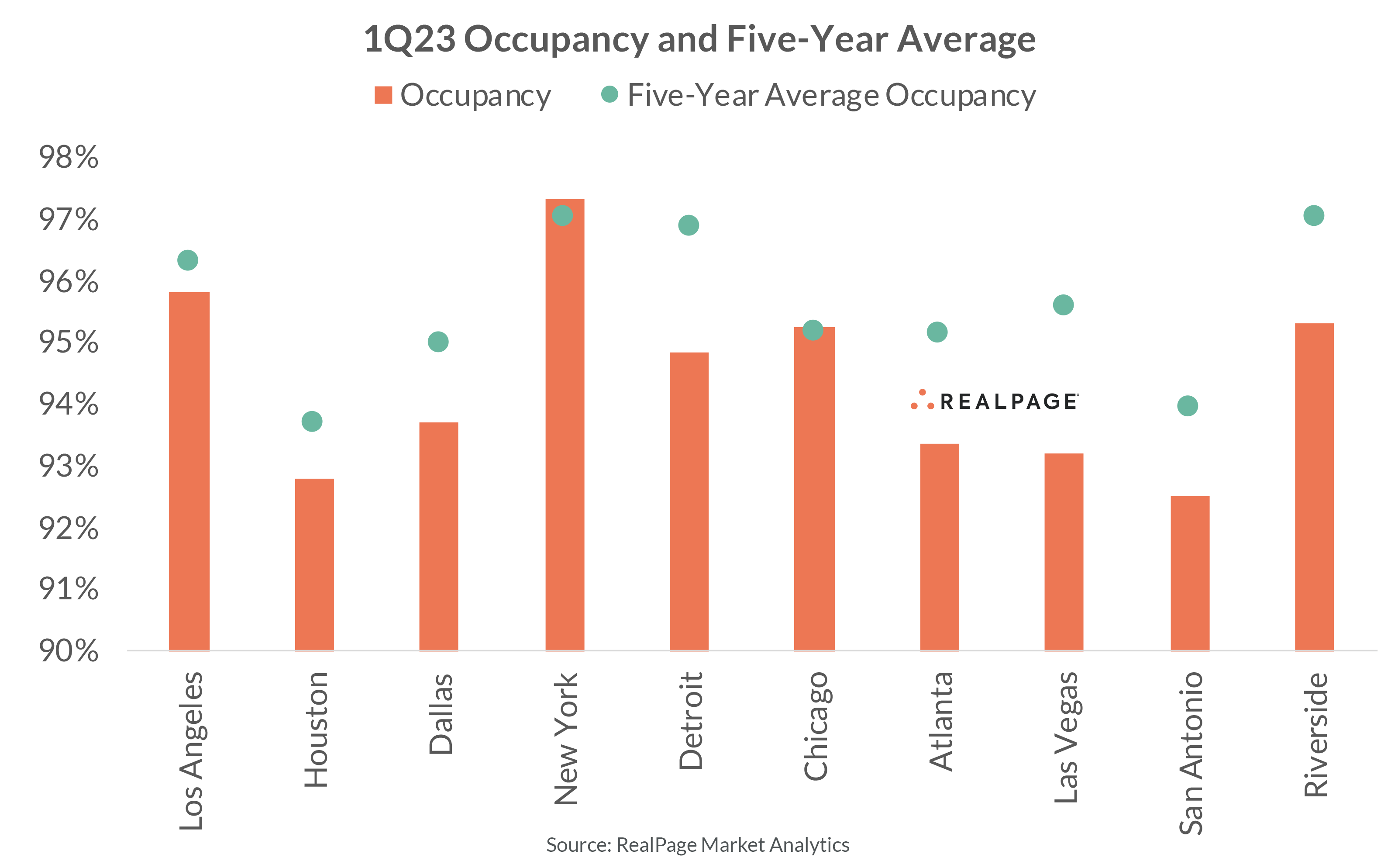 Several of these markets also saw high delivery volumes over the 12-month period, impacting occupancy, including Dallas, Atlanta, Houston, New York and Los Angeles. Occupancy in every market except New York and Chicago sat below the five-year average as of 1st quarter 2023.