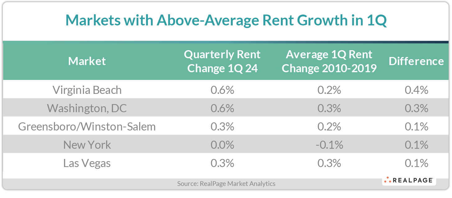 Virginia Beach was the national leader, with rent growth in the first three months of 2024 coming in 0.4% ahead of the market’s pre-COVID 1st quarter average. Washington, DC rent growth in the January to March time frame was 0.3% ahead of pre-pandemic seasonal trends. Both of these markets logged nation-leading price increases of 0.6% in the first three months of 2024.