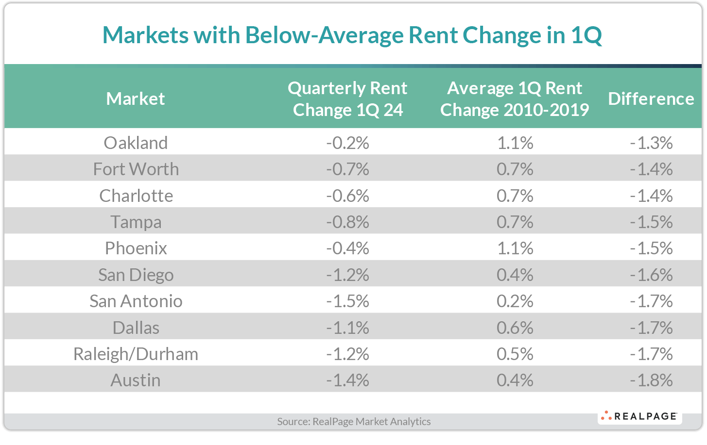 With U.S. apartment rent growth below typical seasonal trends in 1st quarter, only a handful of markets across the nation logged price increases ahead of seasonal norms during the first three months of 2024.