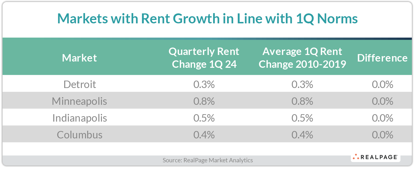 Markets with 1st quarter rent growth in-line with pre-pandemic seasonal trends were – not surprisingly – stable Midwest markets. These metros typically see mild to moderate rent growth – and that continued in the early months of 2024. Price increases between 0.3% and 0.8% in 1st quarter were right in line with pre-COVID norms in Detroit, Minneapolis, Indianapolis and Columbus.