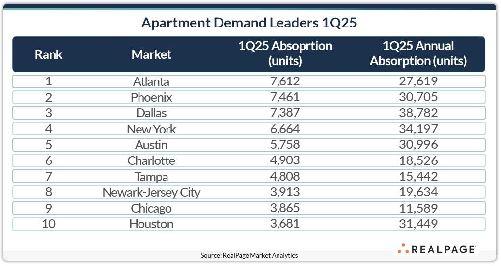 Despite softer economic fundamentals, multifamily demand remains strong. Over 138,000 apartment units were absorbed in 1st quarter 2025, a record high for the first three months of the year. Atlanta led all major markets in 1st quarter absorption, followed by Phoenix and Dallas. Anaheim was the only major market to record net move-outs during the quarter. Looking ahead, RealPage is forecasting the absorption of nearly 460,000 units in calendar 2025.