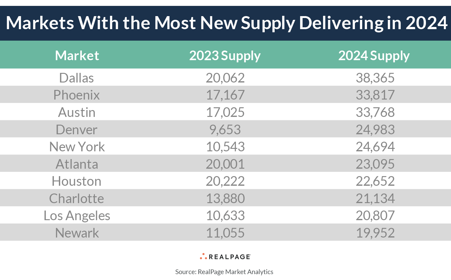 In the Northeast, these big volumes are focused mostly on big-hitting markets like New York (24,700 units) and Newark (19,900 units). Those 2024 volumes are roughly twice the pace these markets logged in deliveries in 2023. These are some of the biggest apartment markets nationwide, each with more than 1 million units, and the pace of supply actually dropped off a bit in 2023 but should pick back up again in 2024.
