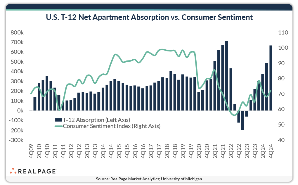 - Changes in consumer sentiment are highly correlated with changes in apartment absorption. In simple terms, as consumers feel better about their economic prospects, there is an accompanying improvement in household formation and consumer spending.