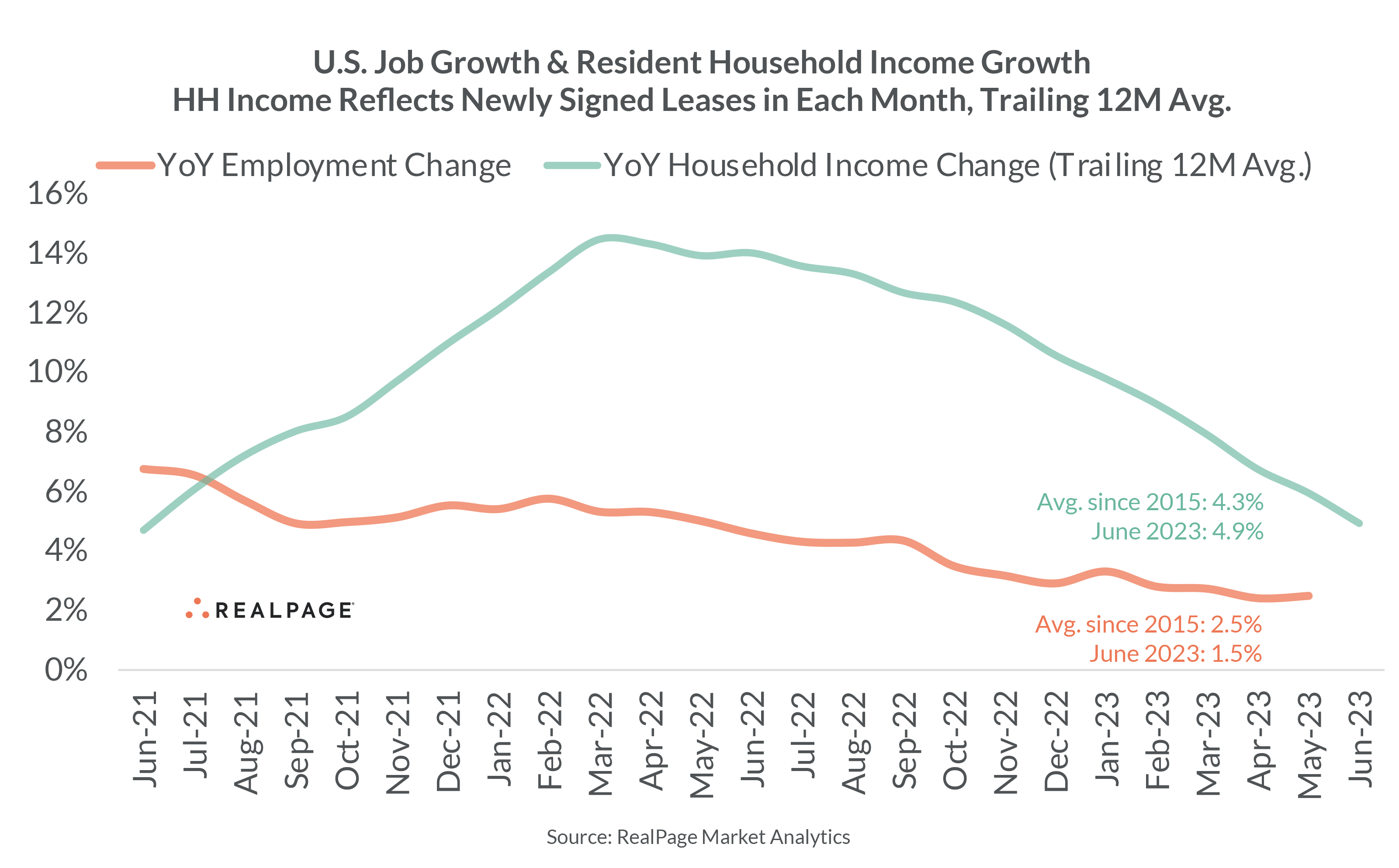 On the back of improved but still muted apartment demand in 2nd quarter 2023, RealPage has downgraded expectations for apartment performance through 2023 and into 2024. Year-to-date rent growth in the U.S. (1.9% through June 2023) clocks in well below the 2010s decade average (3.6%). And that theme is common among most major U.S. markets.