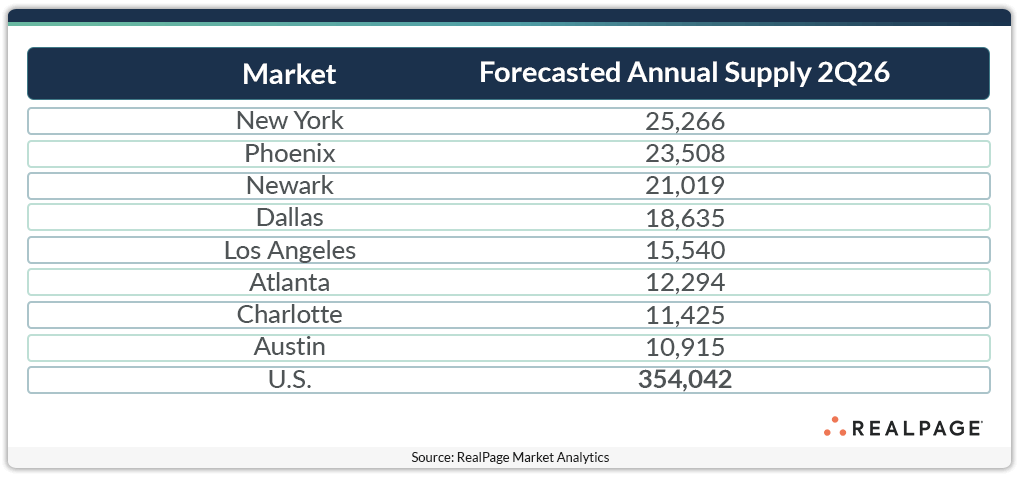 Although the national supply is expected to slow over the next 12 months, more than 100,000 new apartment units are scheduled for delivery in just five markets: New York, Phoenix, Newark, Dallas and Los Angeles, with New York leading for total delivery volume.
