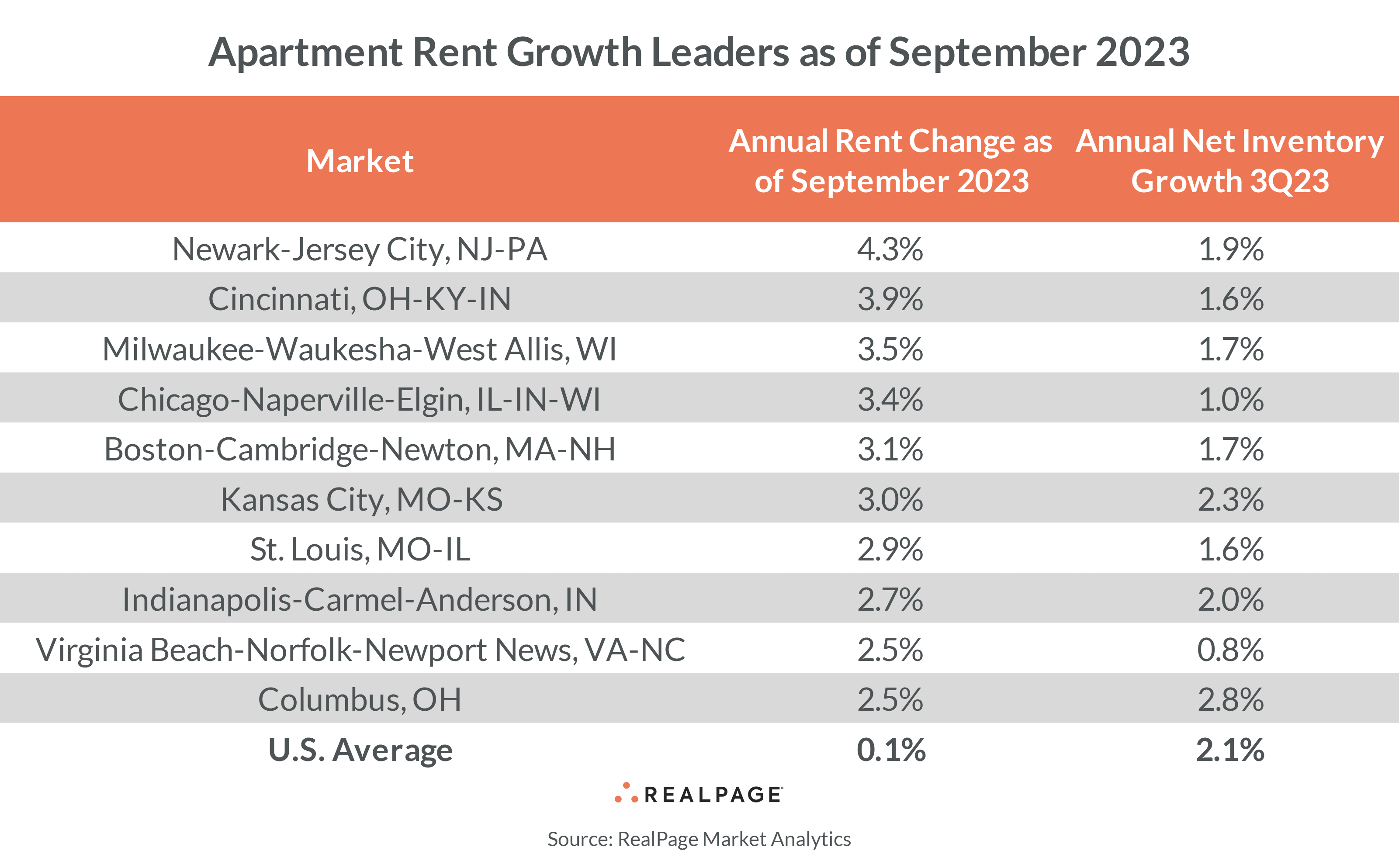 On the flip side, only six large metros recorded rent increases above 3%, led by Newark-Jersey City, NJ, at 4.3%, followed by Cincinnati, Milwaukee, Chicago, Boston and Kansas City. Not coincidentally, the rate of supply expansion trailed the U.S. average in all six with the exception of Kansas City, which came in a tick above.
