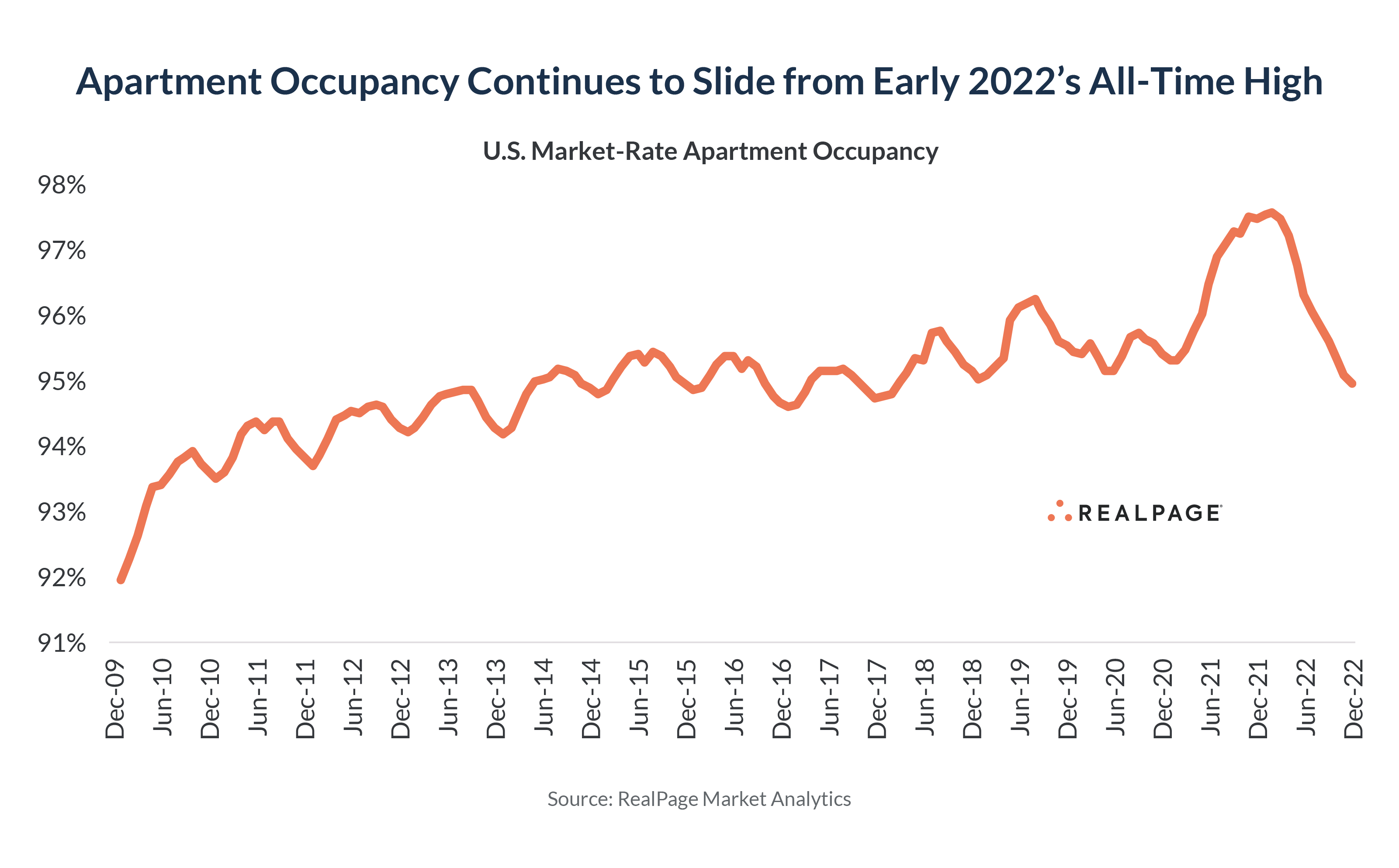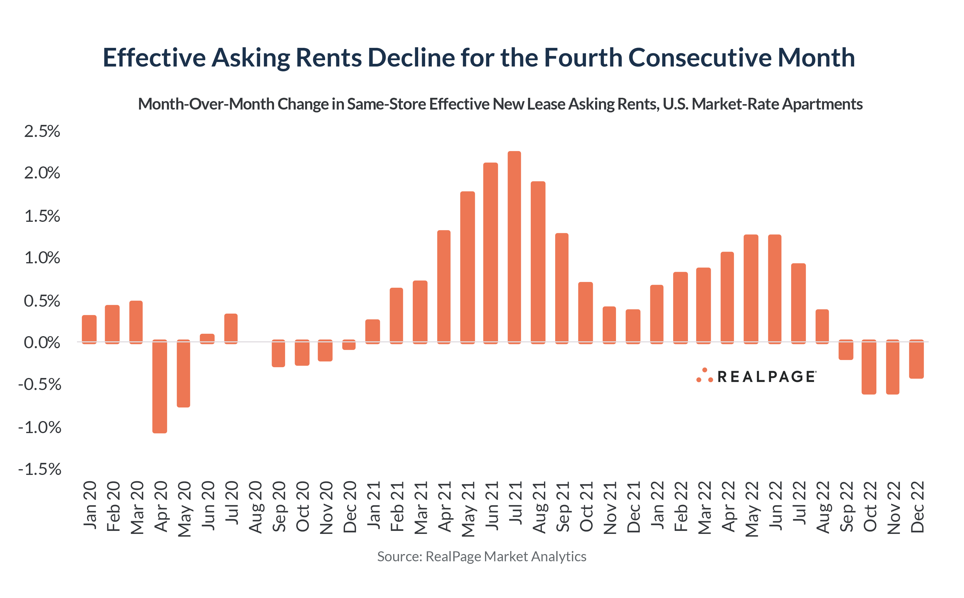 For calendar year 2022 overall, effective new lease asking rents increased 6.1% nationally. That number was inflated by large hikes earlier in the year but has dropped off precipitously since peaking at 15.7% in March. Further cooling will continue into 2023.