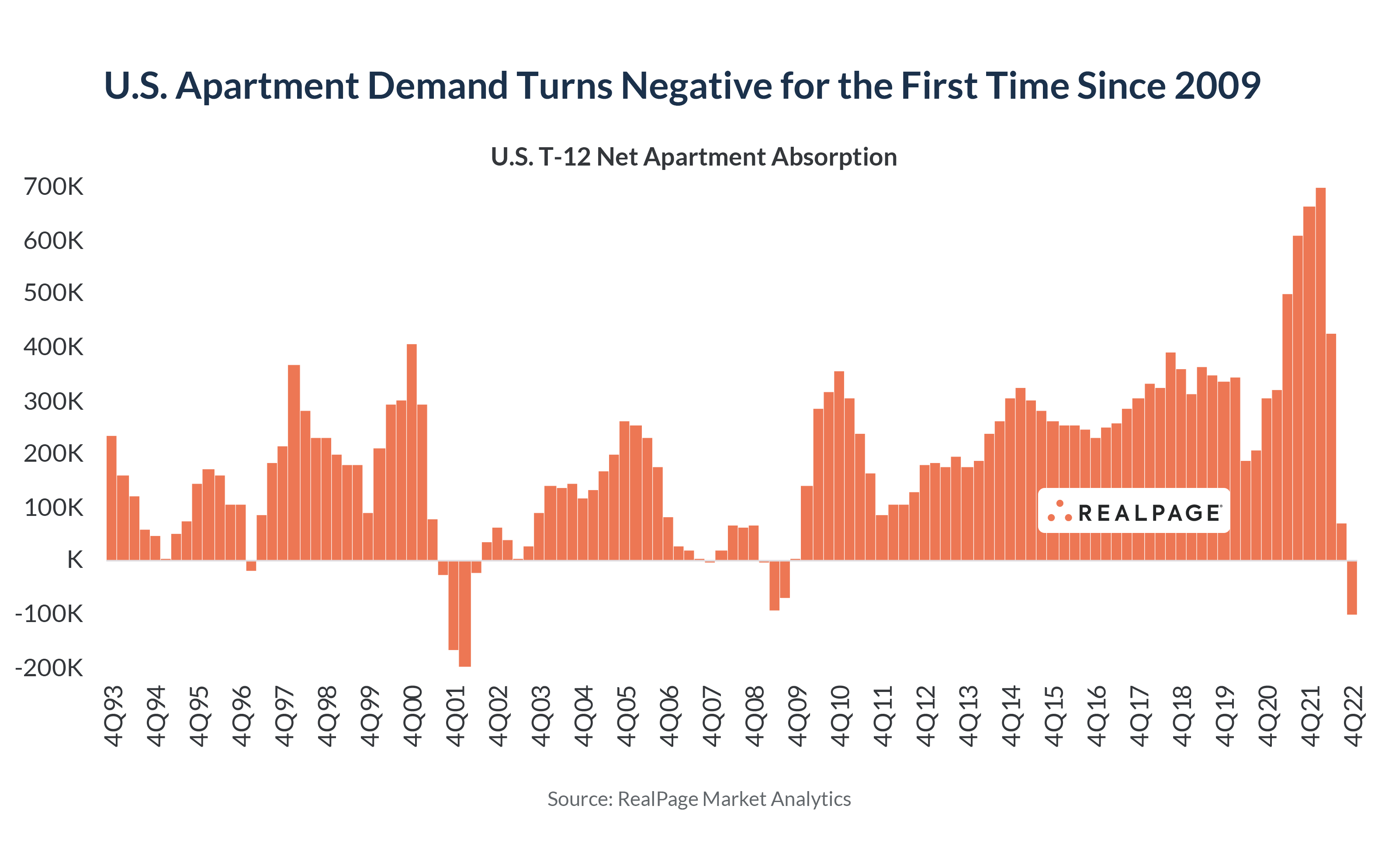Net demand for apartments ended in negative territory for calendar 2022. But, unlike the last time demand went negative in 2009, renter turnover was curiously low in 2022. Instead, the problem was at the front door: Demand for new leases all but evaporated due to low consumer confidence and high inflation.
