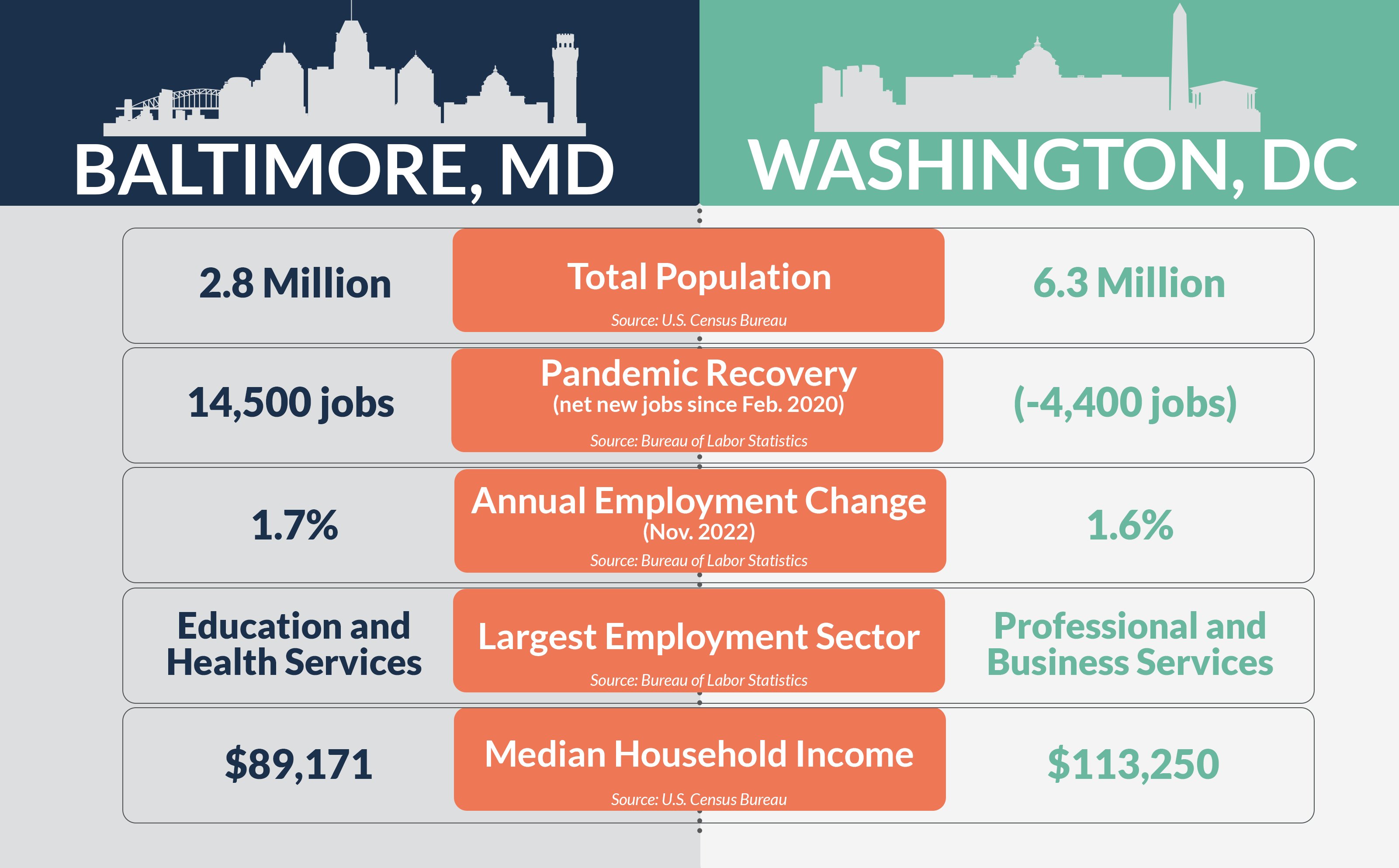 Baltimore’s big two employment centers are Education and Health Services and Trade, Transportation and Utilities. Surprisingly, Washington, DC’s largest employment sector is Business and Professional Services, though Government employment is not far behind.