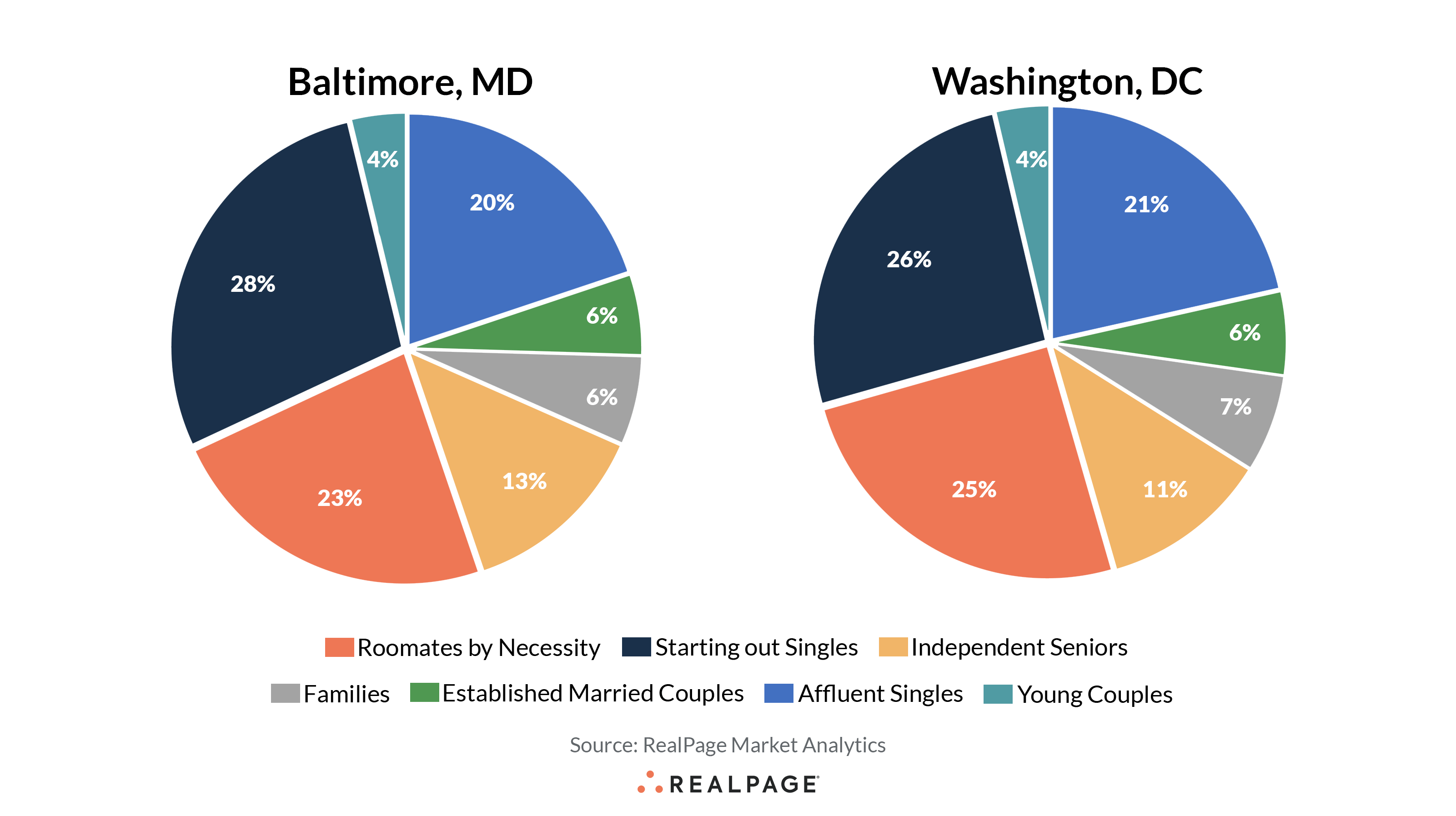 When looking at the makeup of the resident base in these markets, two big renter cohorts stand out. Starting Out Singles is the largest segment of the renter base in both Baltimore and Washington, DC, accounting for about 26% to 28%. Roommates by Necessity is another big slice, with 23% to 25% of the local population hitting in that category.