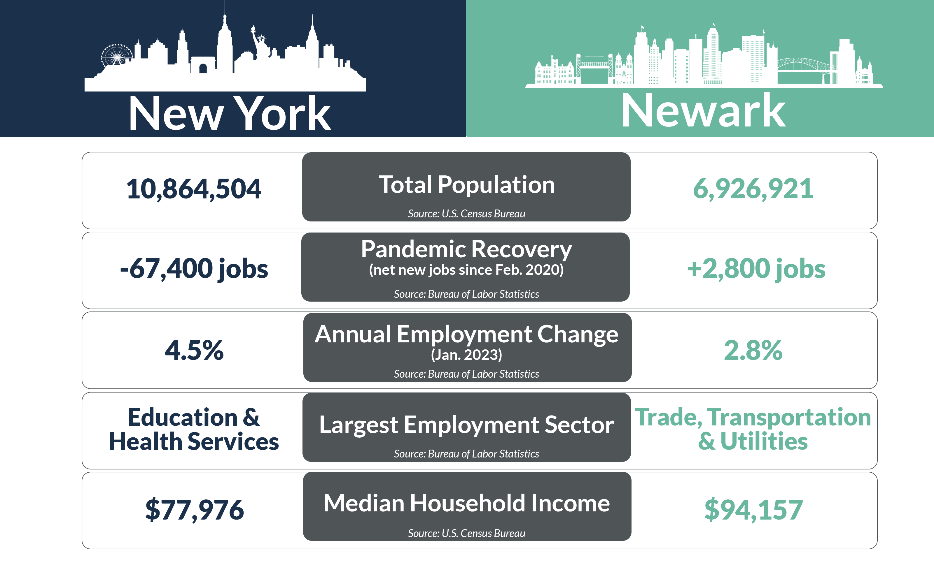 With a combined population of nearly 17.8 million residents, about 5.4% of the nation’s total population resides in New York-White Plains and Newark-Jersey City. New York, of course, claims the larger population at just under 11 million residents, compared to Newark’s nearly 7 million.