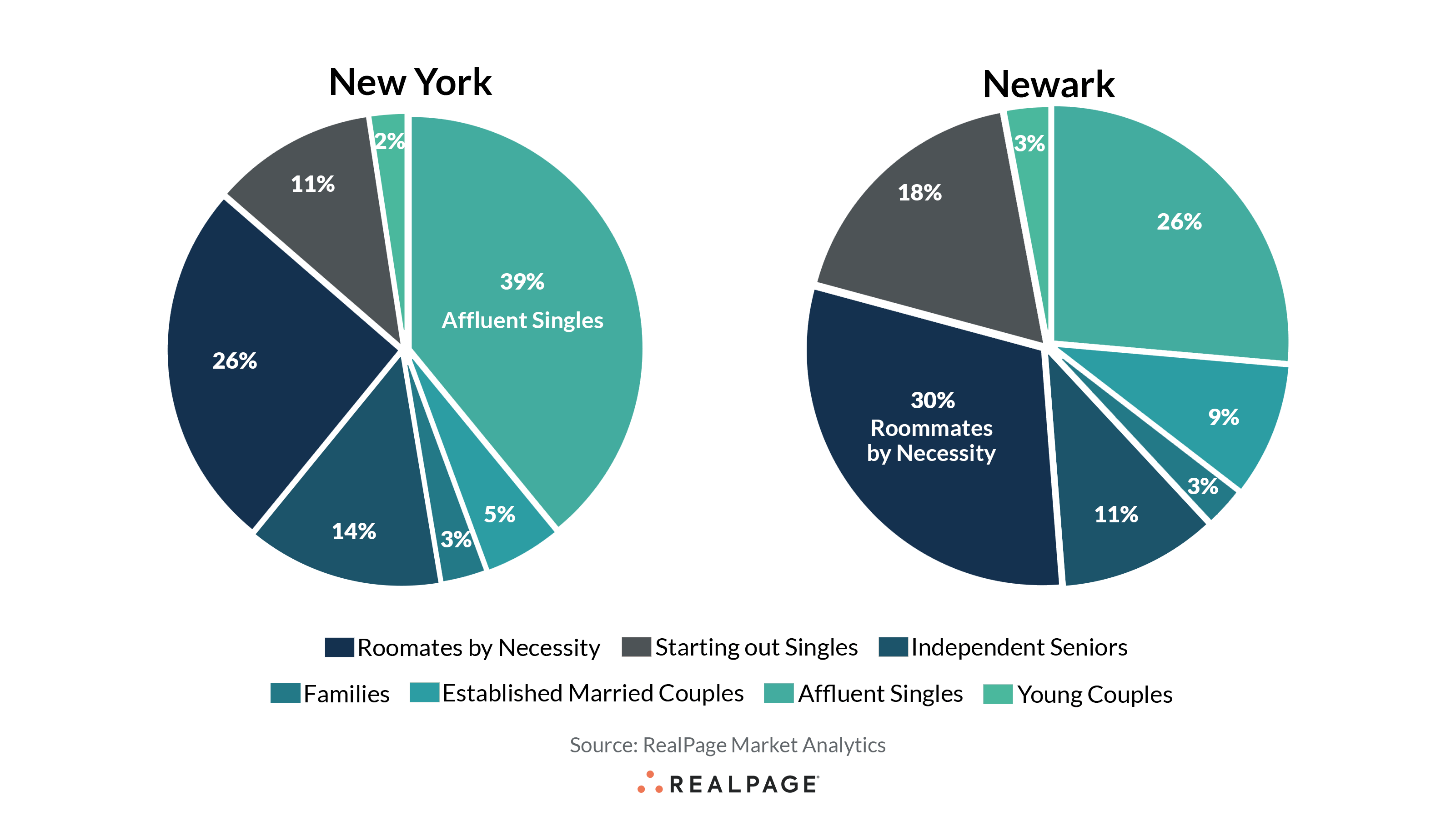 In terms of renter demographics for market-rate apartments, New York and Newark differ in some big ways. New York’s largest renter demographic is easily Affluent Singles, making up about 39% of the market-rate renter pool. In Newark, the largest demographic is Roommates by Necessity, making up about 30% of the renter pool. Both markets have similar rates of Young Couples and Families. Newark has nearly twice the rate of Established Married Couples, as well as more Starting Out Singles. New York, meanwhile, has more Independent Seniors.