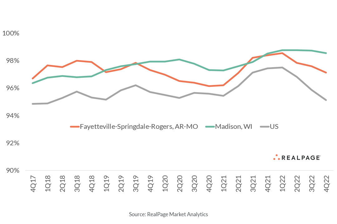 Two small apartment markets are popping up on radars with solid multifamily fundamentals thanks to the economic anchor of a major university: Fayetteville-Springdale-Rogers, home to the University of Arkansas, and Madison, home to the University of Wisconsin-Madison. Both of these small markets tend to register occupancy rates well ahead of the national average. The Fayetteville-Springdale-Rogers metro is home to about 550,000 people. Even with an existing base that has increased by a third over the past decade, demand here remains solid, and occupancy is strong – at 97.1% in 4th quarter. Fayetteville is among the top metros with the highest job growth over the past 10 years, keeping up easily with much bigger markets and bolstering apartment demand. Madison – with about 680,000 residents – was one of the few markets in the country that evaded occupancy contraction over the past year. In fact, Madison consistently maintains one of the tightest occupancy rates in the nation. As of 4th quarter, that rate was at 98.6%. This market is very difficult to build in and typically sees very strong retention rates. Additional economic factors that benefit from the local university are state government offices and an increasingly expanding tech hub.