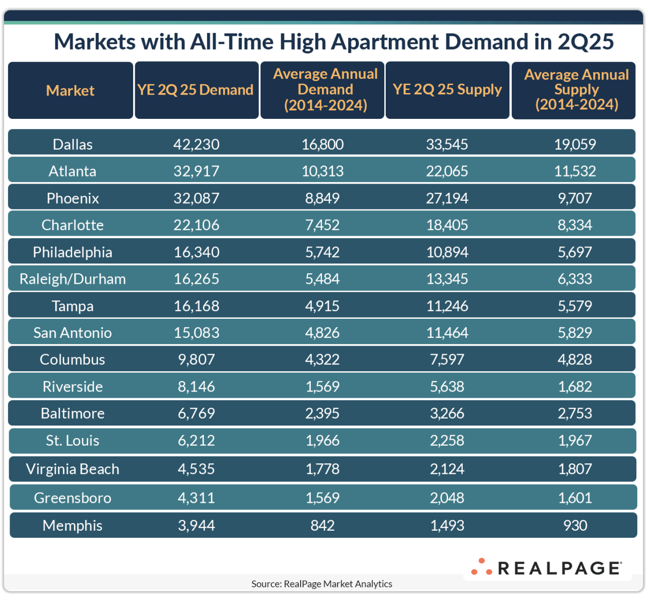 Out of the nation’s 50 largest apartment markets, 15 hit all-time demand records in the year-ending 2nd quarter 2025. In each of these markets, record absorption paced notably ahead of concurrent completion volumes, which were also elevated – in some cases significantly – from historical norms. And the majority of these were in the South region of the country. The demand peak in Dallas was the biggest, with over 42,200 units absorbed in the past year, according to data from RealPage Market Analytics. That was more than double the market’s average annual demand pace over the past 10 years. Atlanta, Phoenix and Charlotte absorbed between 22,000 and 33,000 units in the year-ending 2nd quarter. Demand in those markets was roughly three times the decade norm. A handful of markets absorbed roughly 15,000 to 16,000 units in the past year, including Philadelphia, Raleigh/Durham, Tampa and San Antonio. Those were all also performing at about three times the typical pace for demand. Peak volumes were below the 10,000-unit mark in the remaining seven markets. Among those, Riverside and Memphis logged demand at roughly four to five times their typical pace.