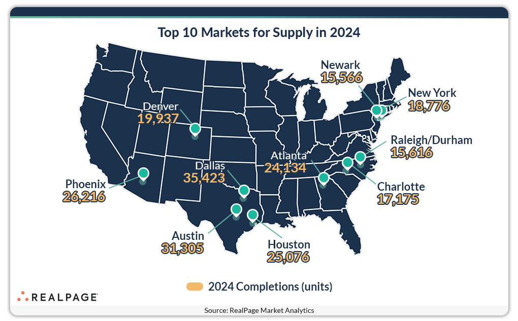 In 2024, nearly 588,900 apartment units delivered across the nation, reaching the highest level since 1974. Markets in the South region captured the lion’s share of new supply in 2024, accounting for 58% of completions, according to data from RealPage Market Analytics. Ten markets across the country delivered more than 15,000 units during the year, led by just over 35,400 units in Dallas. Two other apartment markets in Texas – Austin and Houston – each received around 25,000 to 31,000 units in 2024. Several other South region markets, including Atlanta (24,134 units), Charlotte (17,175 units) and Raleigh/Durham (15,616 units) were among the nation’s top 10 supply leaders in 2024. Two West region markets (Phoenix with 26,216 units and Denver with 19,937 units) and two Northeast region markets (New York with 18,776 units and Newark with 15,566 units) also landed among the nation’s top 10 supply leaders in 2024. Of these top 10 markets for new supply in 2024, all but New York and Newark registered record supply levels during the year. No Midwest markets made the top 10 list. The Midwest leader – Minneapolis – added roughly 9,200 apartments in 2024, ranking #19 nationally.