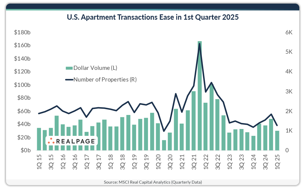 U.S. apartment transactions eased during the first three months of 2025, following historical trends. However, on a year-over-year basis, apartment sales (total dollar volume, number of properties, number of units and price per unit) were up.