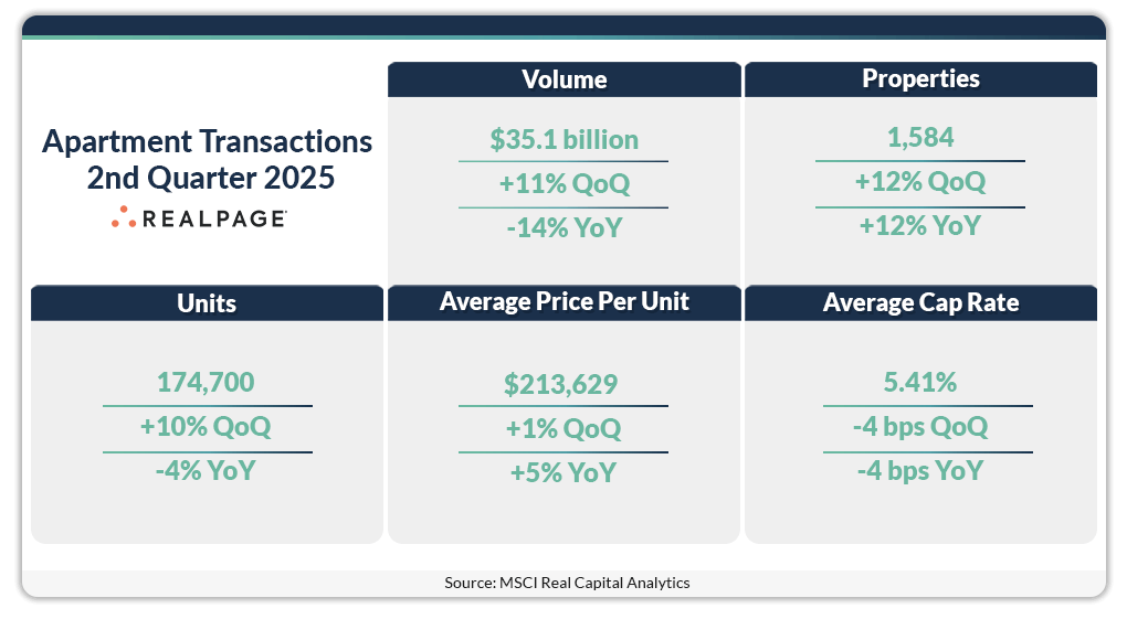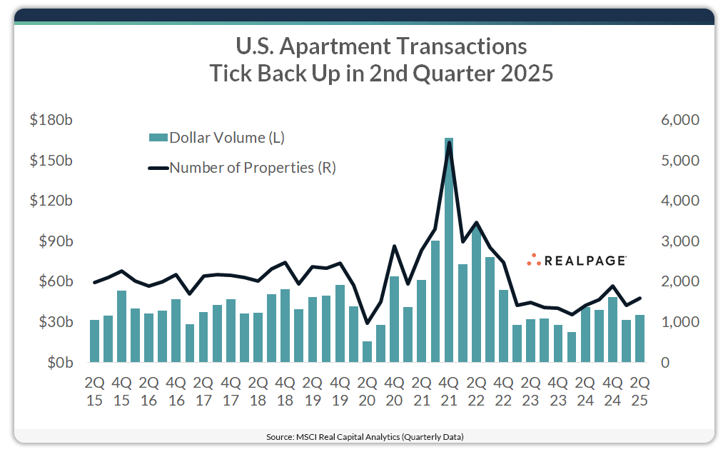 U.S. apartment transactions ticked back up during the April to June 2025 time frame. However, on a year-over-year basis, the total dollar volume of apartment sales were down.