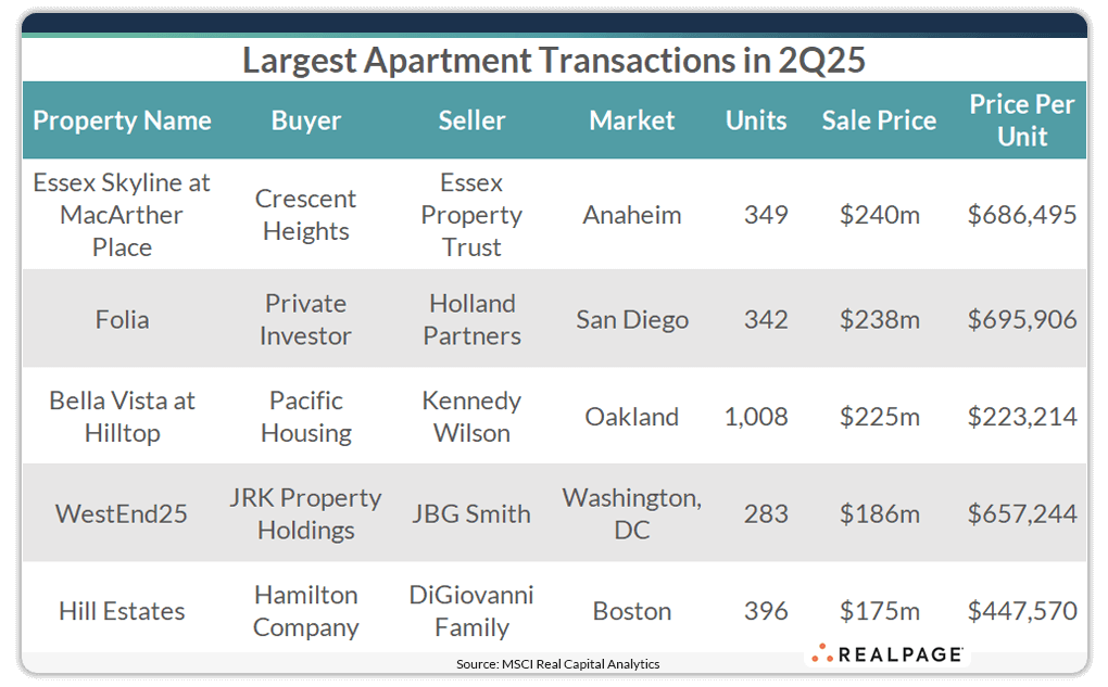 Among the five largest single-asset market-rate apartment transactions during 2nd quarter 2025, all sold for $175 million or more. The West region had three of those transactions, while the Northeast and South each had one transaction.