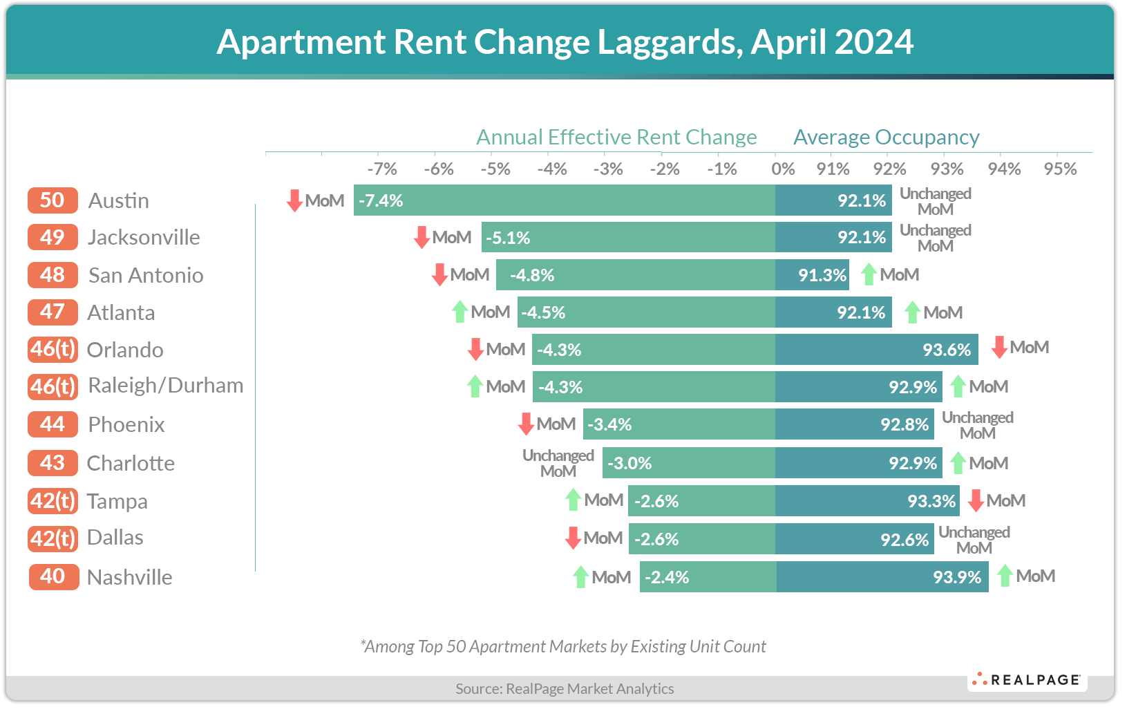 The list of rent growth laggards again showed a clear correlation that high-supply markets (generally in the Sun Belt) tended to post the deepest rent cuts as of April. A few of these markets – Atlanta, Orlando and Tampa – posted mild rent improvement in April, just not enough to counter deeper rent cuts on an annual basis.