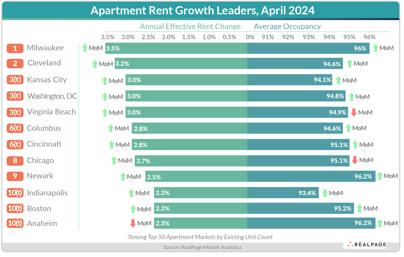 Of the 14 major markets that recorded rent growth of 2% or more in the year-ending April 2024, eight of those are in the Midwest, led by Milwaukee’s 3.5% rent expansion. Another cluster of top-performing markets for rent growth are along the eastern seaboard, including Washington, DC, Virginia Beach, Newark and Boston.