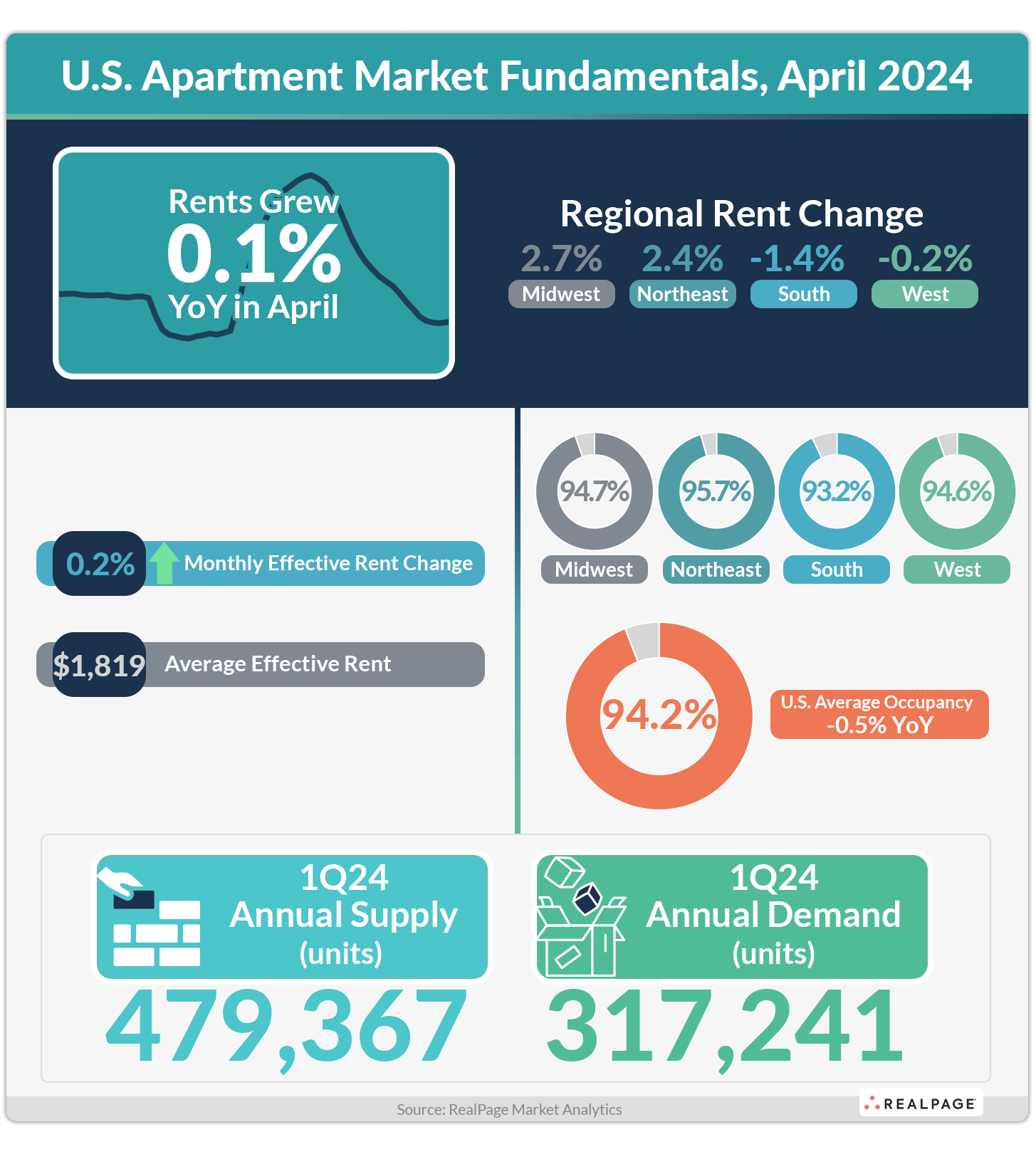 For the first time since February 2022, the national average for apartment occupancy ticked up month-over-month to stand at 94.2% in April 2024, according to data from RealPage Market Analytics. That rate is a mild 10 basis points (bps) above March’s reading. That trend was seen nationwide as all four apartment regions – Northeast, Midwest, South and West – recorded occupancy strengthening by 10 bps from March to April.