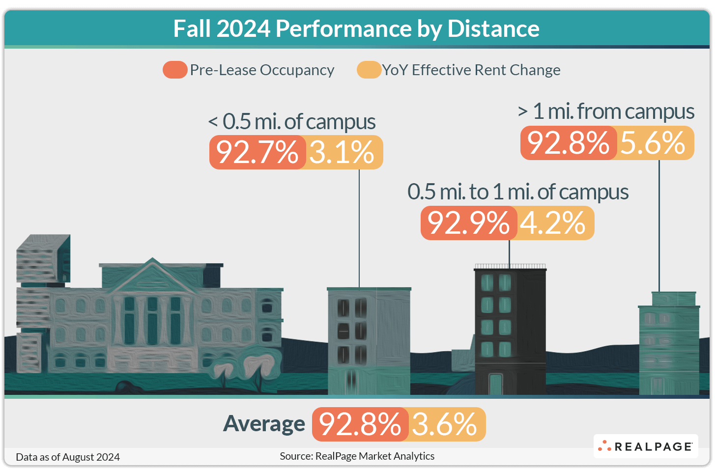 Across the RealPage 175, annual effective rent growth softened to 3.6% in August, which was the lowest rate seen so far this pre-lease season. Properties more than one mile from campus continued to report the strongest rent growth at 5.6% as of August, followed by slightly softer readings at properties closer to campus.