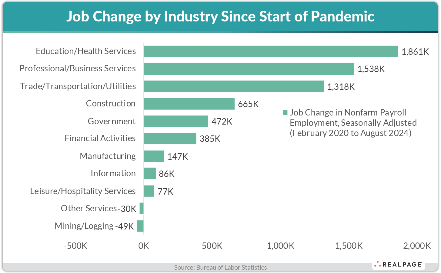 Most major industries have recovered all the jobs lost during the COVID-19 pandemic downturn. Education and Health Services has seen the best recovery, with the August 2024 job count coming in roughly 1.86 million positions ahead of February 2020 numbers, followed by Professional and Business Services (+1.54 million jobs). Also well ahead of pre-pandemic norms was Trade, Transportation and Utilities (+1.32 million jobs).
