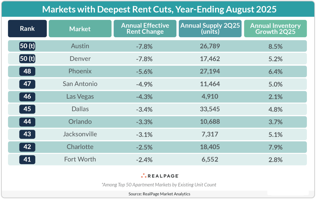 Other markets that continue to see deep rent cuts are supply-heavy areas like Austin, Denver, Phoenix, Dallas and Charlotte.