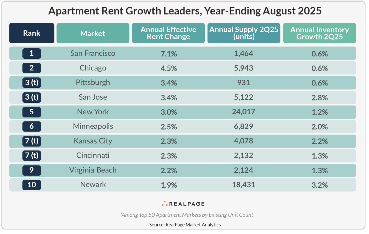 On the other hand, tech-heavy coastal markets like San Francisco, San Jose and New York continued to rank among the largest 50 apartment markets with the most rent growth, with prices climbing 3% to 7% in the year-ending August.