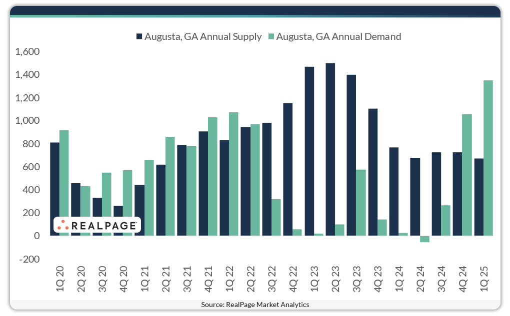 Apartment demand hit an all-time high in the small Augusta, GA apartment market in the year-ending 1st quarter, pushing well ahead of concurrent supply volumes. Augusta joins a handful of other small apartment markets between 30,000 to 50,000 units of existing stock to hit an all-time absorption high in the early months of 2025, including Florida markets Myrtle Beach, Lakeland and Pensacola, as well as Trenton, NJ in the Northeast. Demand reached 1,351 units in Augusta in the year-ending 1st quarter, more than doubling the 675 units of supply delivering in the market in the same time period, according to data from RealPage Market Analytics. For comparison, over the past five years, annual demand has averaged closer to 600 units in this market. As a result of surging absorption volumes, occupancy in Augusta has rebounded, tightening 440 basis points in the past year to land at 95.3% in April, well ahead of the market’s long-term average.