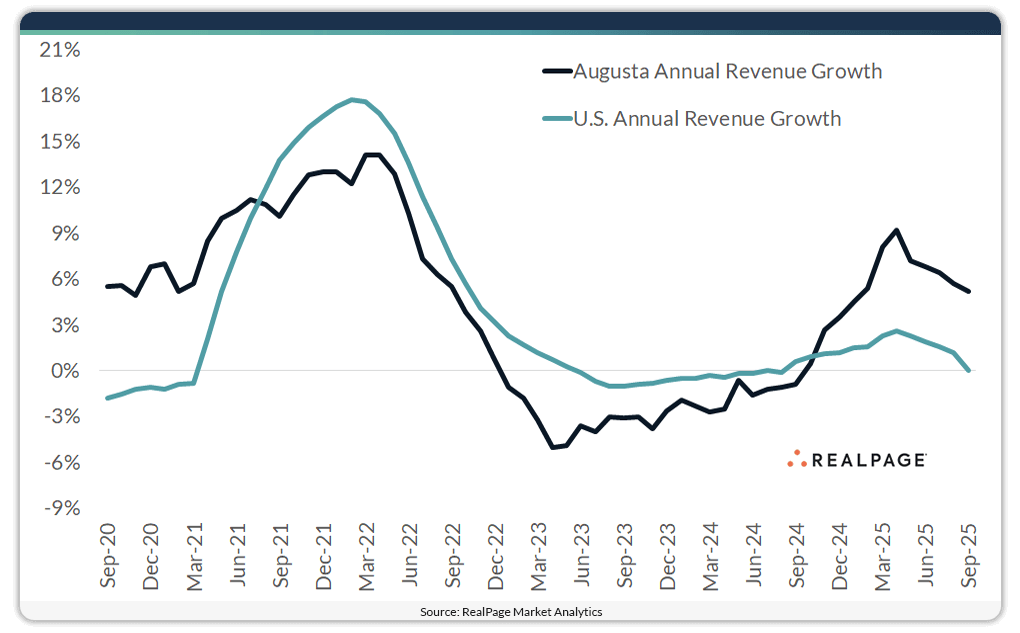 The small Augusta apartment market recorded one of the nation’s largest revenue increases in September. At 5.2%, annual revenue growth in Augusta, which has about 34,100 existing units, ranked #4 among the nation’s 150 largest apartment markets and was the highest increase across the Southeast, according to data from RealPage Market Analytics. While the latest revenue growth performance in Augusta was ahead of the market’s five-year average (4.1%), it was down from the recent annual peak of more than 9% in April 2025. Apartment demand hit an all-time high in Augusta recently, helping occupancy climb to 95% as of September, up 190 basis points for the year. In addition, Augusta’s recent occupancy rate was well ahead of the market’s five-year average (94.4%) but still behind the peak rates above 97% the market hit in 2021 and 2022. Meanwhile, effective asking prices were up 3.3% year-over-year as of September. While solid, that figure was slightly behind the market’s five-year average annual increase of 4.4%.