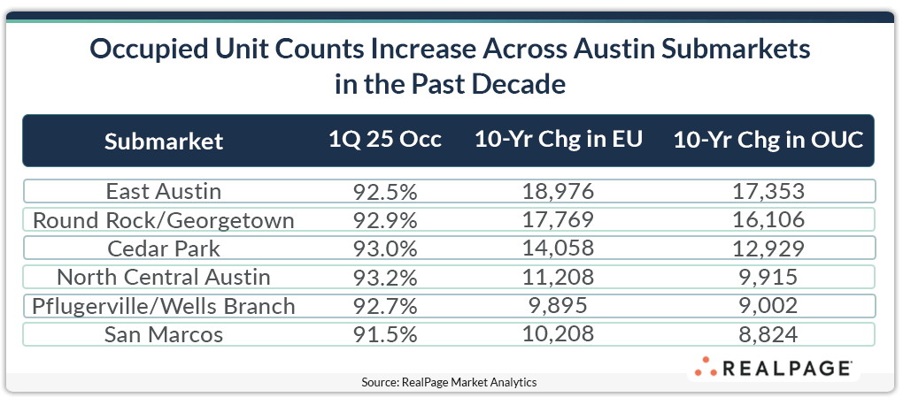 The submarket that saw the biggest growth in occupied units over the past decade was East Austin. This area just east of downtown saw its existing base expand nearly 19,000 units since early 2015. The growth in occupied units was similar at 17,353 units.