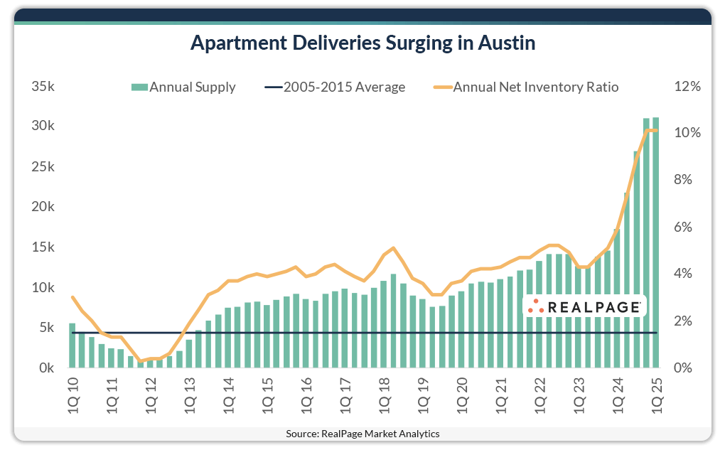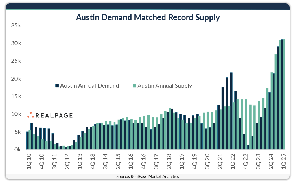 Supply volumes hit a record high in Ausitn recently, with over 31,000 new units delivered in the year-ending 1st quarter, according to data from RealPage Market Analytics. That was one of the biggest volumes nationwide (topped by only Dallas) and more than doubled Austin’s average annual completion volumes of roughly 13,000 units from the past decade (2015 to 2025). And the last decade’s completion pace in Austin was more than double the average annual volumes of 4,400 units in the decade before that (2005 to 2015).