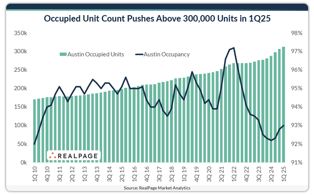 With demand and supply both hitting record highs, the volume of occupied units in Austin increased nearly 117,000 units in the past decade. Back in 1st quarter 2015, there were nearly 207,000 existing units in Austin. Roughly 95% of those were occupied, meaning there were nearly 196,000 filled units in the market. Ten years later, the existing unit count in Austin has swelled to more than 336,000 units. With an average of about 93% occupied in 1st quarter 2025 (just a bit lower than the monthly average), there are now over 312,000 occupied apartments in the Austin market.