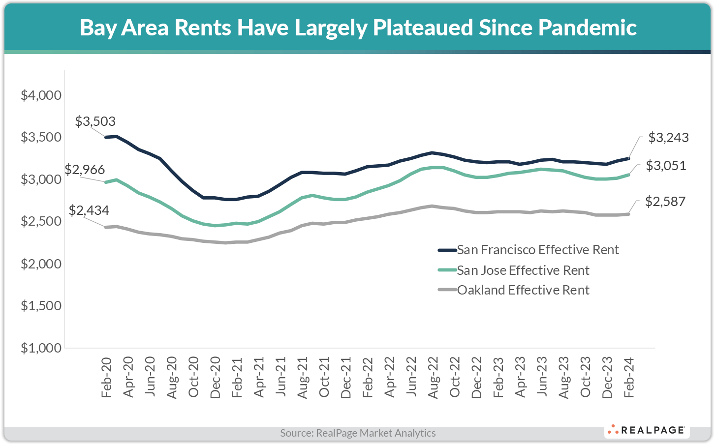 In contrast, on the other side of the country, the Bay Area saw effective rents stagnate in that time frame. Within the three Bay Area markets of San Francisco, San Jose and Oakland, the price of rent has all but flatlined – and even declined in the case of San Francisco – since February 2020.