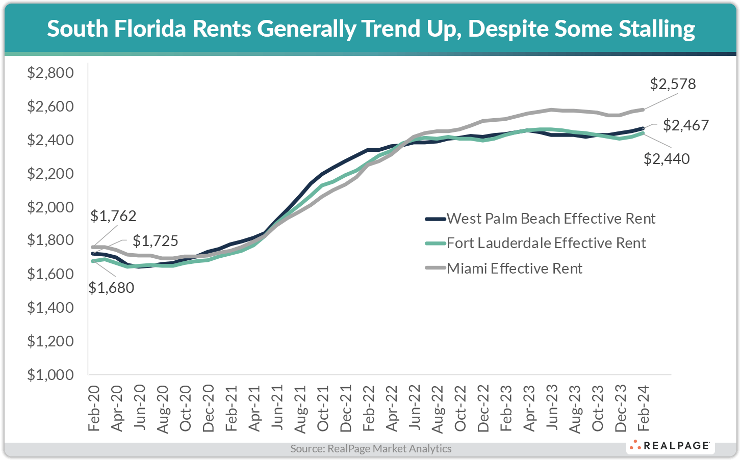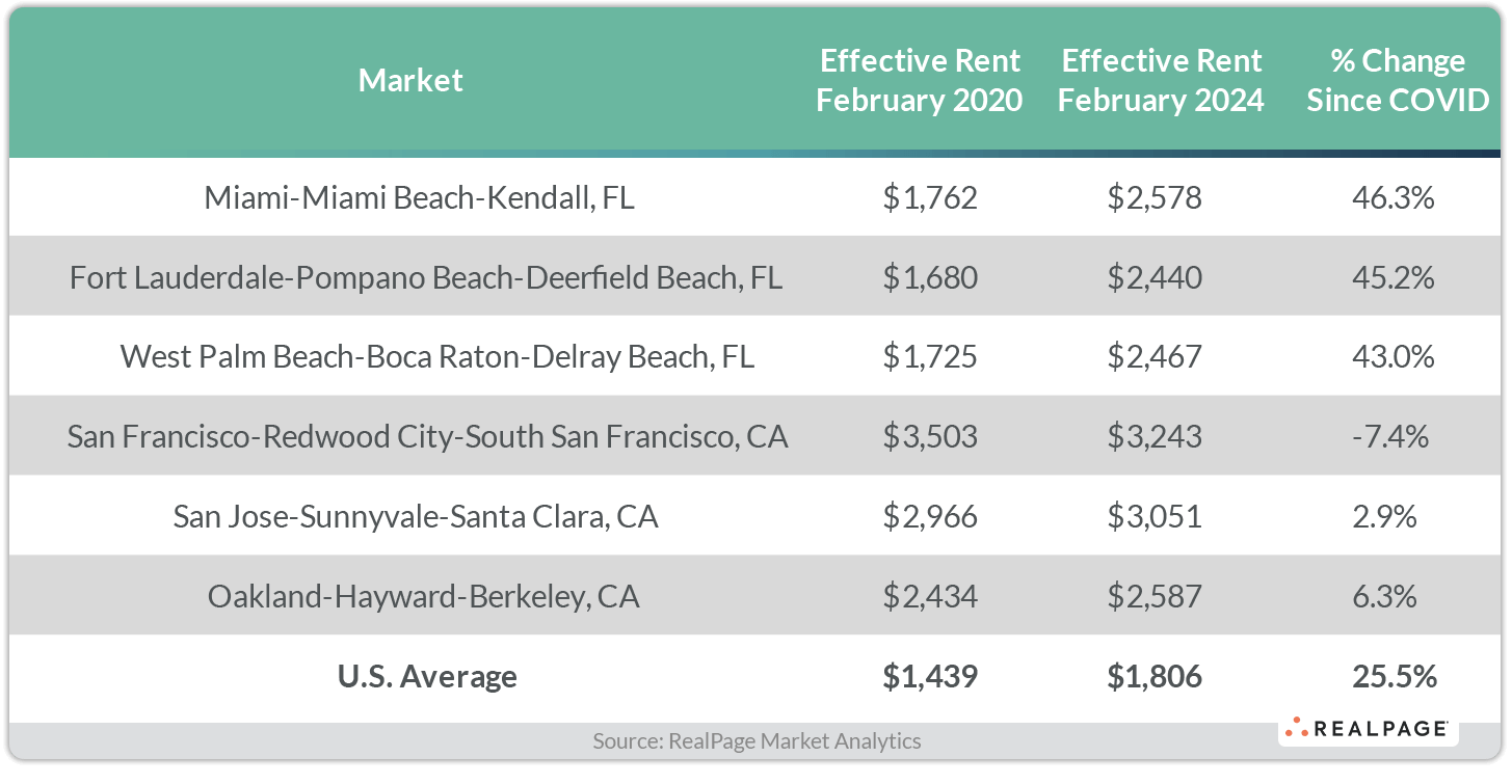In South Florida, which is comprised of three markets including Miami, Fort Lauderdale and West Palm Beach, effective rents have climbed by the highest dollar differential in the nation since February 2020, equating to a more than 43% jump in four years.