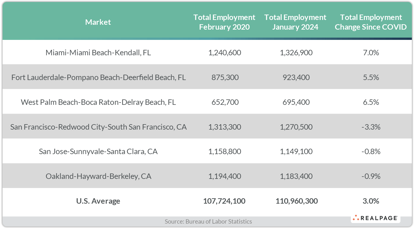 Employment growth – which tends to run hand-and-glove with population growth – has also been stronger in South Florida since the pandemic began. All three South Florida markets have grown total employment at a rate faster than the national norm – more like double – since early 2020. Miami leads the trio of South Florida markets with total employment growth of 7% from February 2020 to January 2024, which is the latest available data from the Bureau of Labor Statistics. West Palm Beach and Fort Lauderdale recorded employment gains of 6.5% and 5.5%, respectively, during that time.