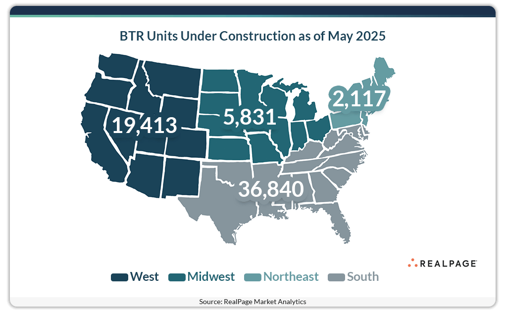 Accounting for about 57% of units under construction, the Sun Belt continues its streak as a the industry’s development leader. With about 36,840 BTR units underway (including properties in lease-up where construction is ongoing), the South leads the nation. Those units are projected to complete by May 2027.
