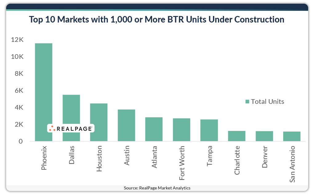 Among markets, Phoenix stands head-and-shoulders above other Sun Belt peers as over 11,500 BTR units were underway there as of June. Considered the birthplace of BTR, it’s no surprise that Phoenix accounted for roughly 18% of the U.S. total.