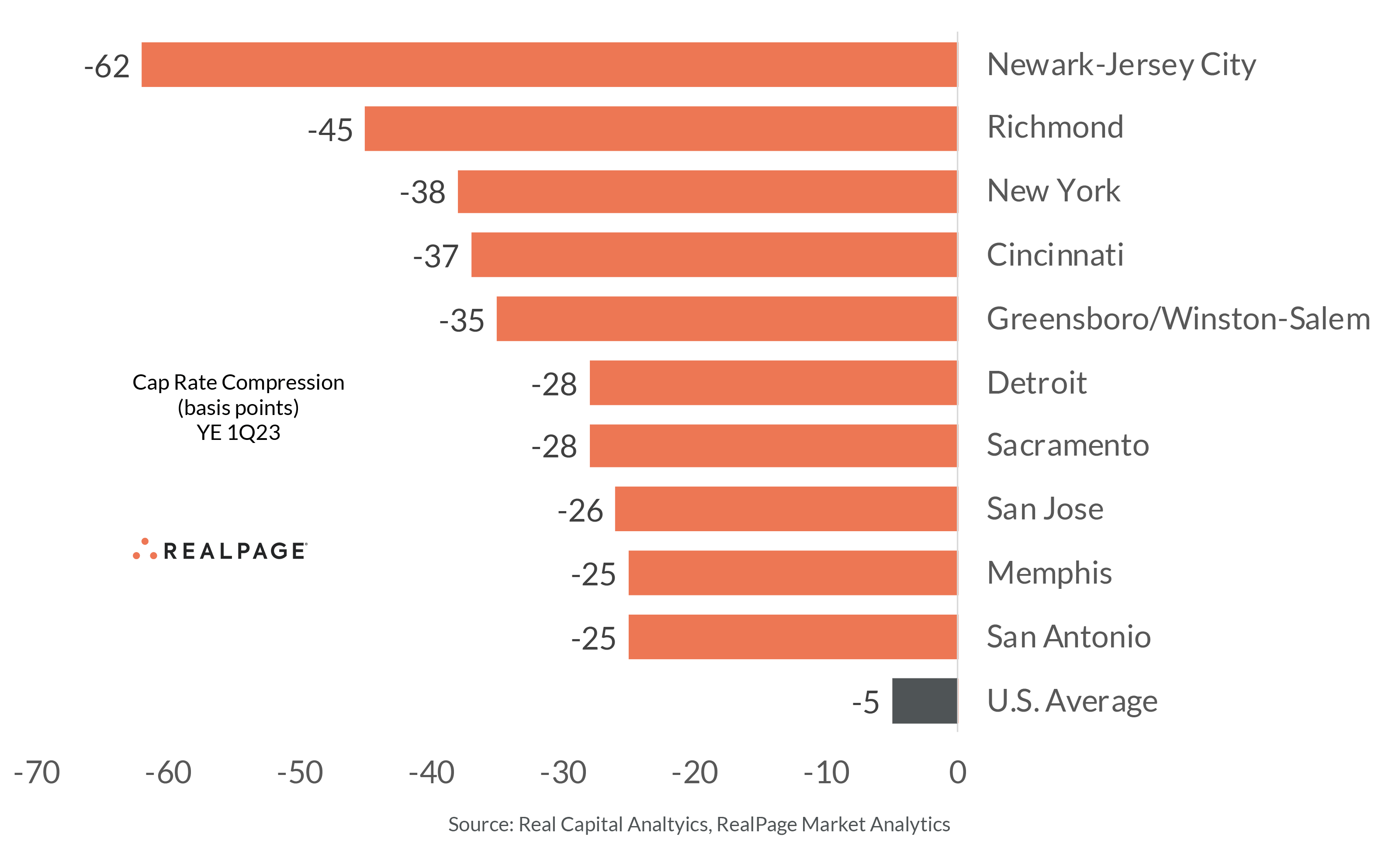 Apartment cap rates continued to fall over the past year for most of the nation’s largest markets and some of the deepest declines have been in locales that are typically slow-and-steady performers. A total of 31 of the nation’s top 50 markets tracked by RealPage Market Analytics recorded declining cap rates during the year-ending 1st quarter 2023, according to data from Real Capital Analytics. Markets with the steepest drops were spread across the country, with four in the South region, while the other three regions were each represented by two markets. The deepest compression was recorded in Newark-Jersey City, which saw cap rates fall 62 basis points (bps) year-over-year to 4.07%, the eighth-lowest cap rate nationally. Cap rate declines in excess of 30 bps were also recorded in Richmond (-45 bps), New York (-38 bps), Cincinnati (-37 bps) and Greensboro/Winston-Salem (-35 bps). Rounding out the top 10 markets for cap rate compression were Sacramento (-28 bps), Detroit (-28 bps), San Jose (-26 bps), San Antonio and Memphis (both -25 bps). San Jose’s decline took its average annual cap rate to 3.78%, the second-lowest cap rate among the nation’s top 50 markets, behind only Phoenix (3.77%). None of the other top 10 markets for cap rate compression landed among the 10 markets with the lowest cap rates nationally. Despite the cap rate freefall in Cincinnati, Memphis and Detroit, those markets still landed among the markets with the 10 highest cap rates nationally.