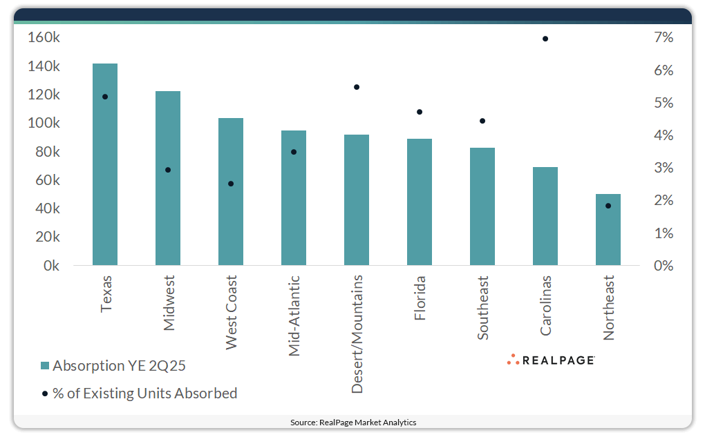 Apartment markets across the Carolinas continued to bask in peak apartment demand recently. The region absorbed over 69,200 units in the year-ending 2nd quarter, which was a record for the region and more than double the five-year average. When looking at demand as a share of the region’s total existing unit count, the Carolinas came out notably ahead of the nation’s other regions. The Carolinas had 995,200 existing apartment units as of 2nd quarter, which was the smallest volume nationwide. That means the past year’s demand total represents 7% of the Carolinas region’s existing stock of apartments. By comparison, in the Southeast – the closest to the Carolinas geographically – annual demand for 82,500 units represented just 4.4% of the region’s existing product base. The closest to the Carolinas in size of existing stock was the Desert/Mountains region, which absorbed 91,800 units, or 5.5% of its rental base.
