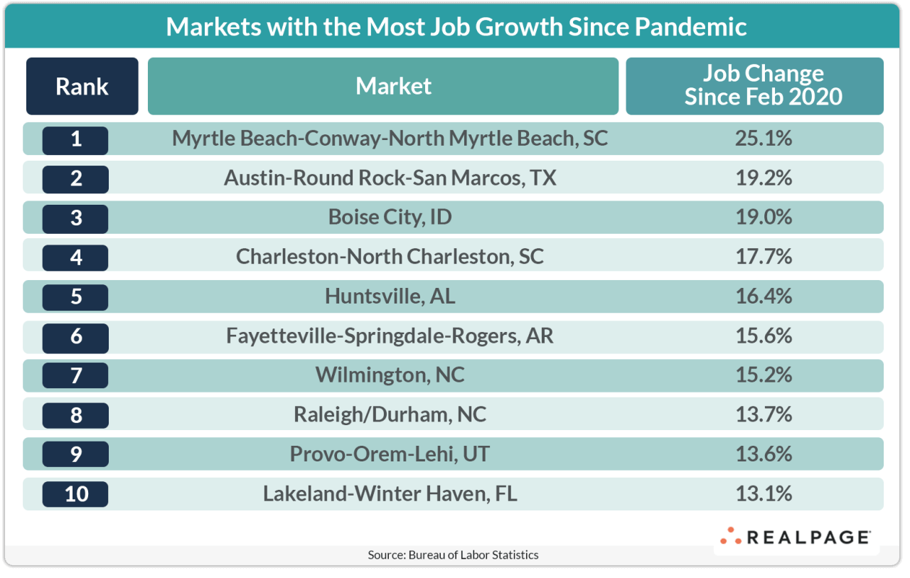 Among the top 10 markets leading the nation for employment growth in recent years, four were in the Carolinas. Myrtle Beach was the U.S. leader for job growth since the onset of the pandemic, with an employment base that increased by 25.1% between February 2020 (the last month of normalcy before the pandemic decline began) and July 2025, according to the latest data from the Bureau of Labor Statistics. (If we examined a standard five-year growth point, job increases nationwide would be artificially inflated, given that July 2020 was an abnormally low point in the U.S. economy.) Charleston has seen its employment base swell by 17.7% since right before the pandemic, while Wilmington and Raleigh/Durham have enjoyed upturns of about 14% to 15%. Outside of the Carolinas, the other markets making the top job gain list were more spread across the country. Austin and Boise were the #2 and #3 performers, with job gains around 19% since the pandemic. Employment increases were closer to 16% in Huntsville and Fayetteville and a bit lower at around 13% to 14% in Provo and Lakeland.