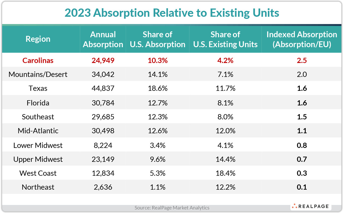 Apartment demand in North Carolina and South Carolina ranks as the strongest in the nation, indexed by relativity. The Carolinas garnered apartment demand for 2.5 times more than the share of existing local stock in calendar 2023, topping every other region for the measure. Apartment markets in the Carolinas absorbed nearly 25,000 units on net in calendar 2023. That accounted for about 10% of all U.S. absorption. But the Carolinas make up a relatively small piece of existing units across U.S. multifamily stock, with just a 4.2% share. Given the size of existing stock across the North and South Carolina, indexed absorption was especially high here in 2023. Indexed demand was also significant in the Mountains/Desert region and in Texas, Florida and Southeast markets last year. While total absorption volumes were quite a bit higher in those regions, the share of existing stock in those areas is also significantly bigger. In comparison, the Lower Midwest region has about the same share of existing stock as the Carolinas, but total demand in the Lower Midwest was much smaller, translating to a much milder indexed pace.