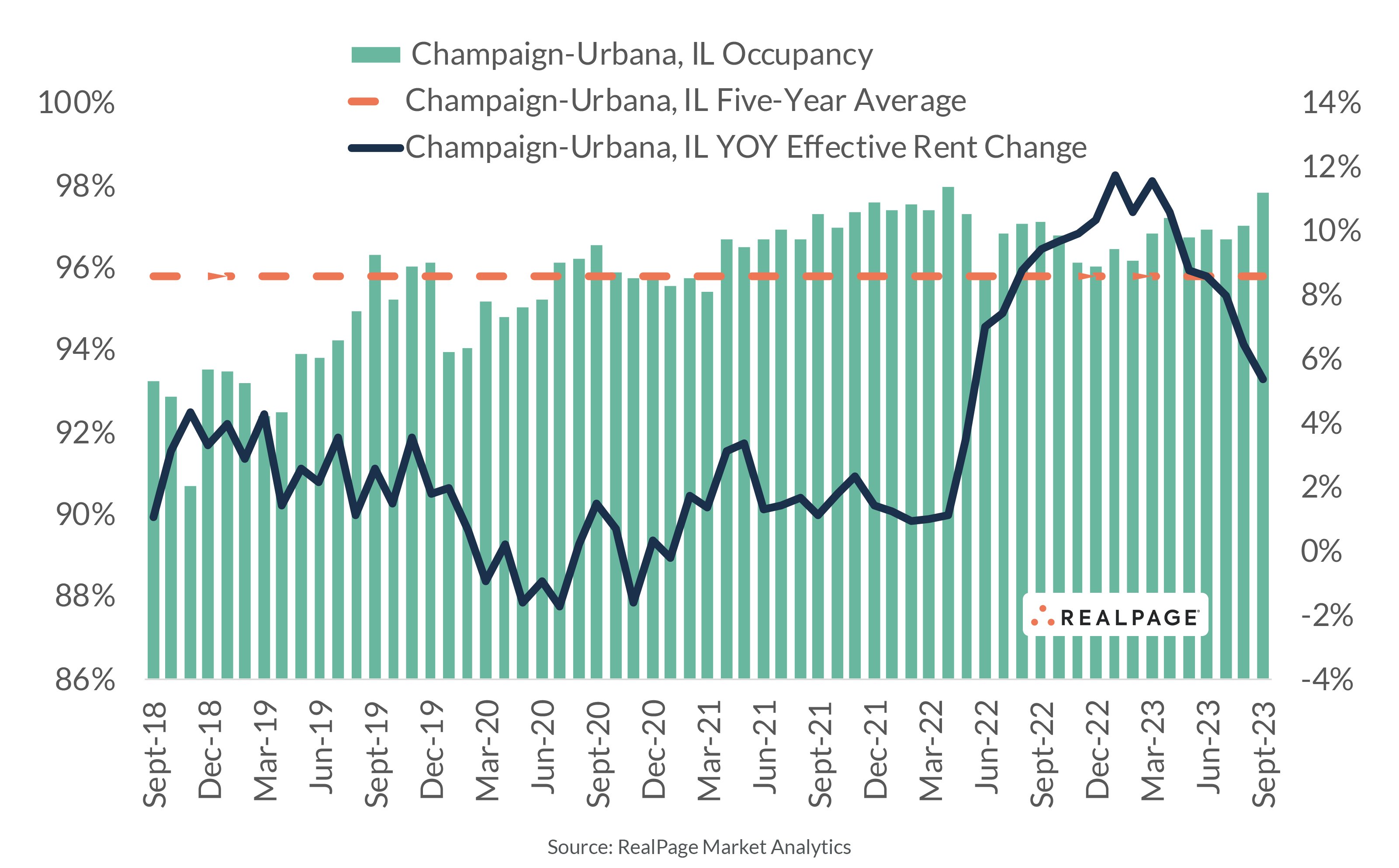 Champaign-Urbana bucked the trend of increasing vacancies seen across much of the U.S. in September. Occupancy in this market located about two hours outside of Chicago climbed a significant 80 basis points (bps) month-over-month and 70 basis points year-over-year to 97.8%, a top five national performance. September’s occupancy rate also outpaced the market’s five-year average by about 200 bps and was roughly 300 bps ahead of the Midwest average (95%) and U.S. norm (94.4%). A strong renter pool helps to fuel demand in this small market which is home to the University of Illinois at Urbana-Champaign. The metropolitan area boasts a population of more than 236,800 people based on 2021 estimates from the U.S. Census Bureau, with around 57,000 students enrolled at the university. According to data from RealPage Market Analytics, there are 27,190 existing apartments in this small market which includes nearly 8,500 student competitive beds (conventional beds within close proximity to campus, often leased by students). If we focus on student competitive beds, occupancy proves even stronger at 98.4%. Such hefty demand fosters rent growth across the market. Although rent growth has fallen from the record high of 11.8% reached in January 2023, operators still pushed rents a strong 5.4% in September, above the market’s five-year average (3.6%). Yet, despite consistent increases over the past 34 months, rents in Champaign-Urbana ($988) remain reasonably priced at more than $800 below the U.S. norm ($1,821) as of September.