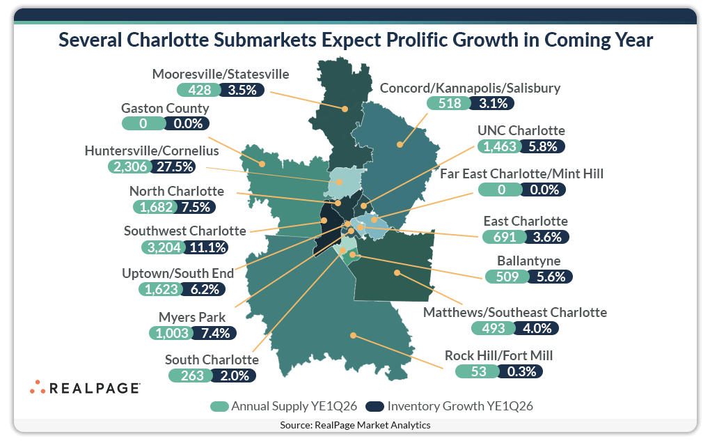 Five of Charlotte’s 15 submarkets are set to receive nearly three-fourths of the market’s completions in the coming year. Southwest Charlotte (3,204 units) is expected to lead again for new supply, followed by Huntersville/Cornelius (2,306 units), North Charlotte (1,692 units), Uptown/South End (1,623 units) and UNC Charlotte (1,463 units).