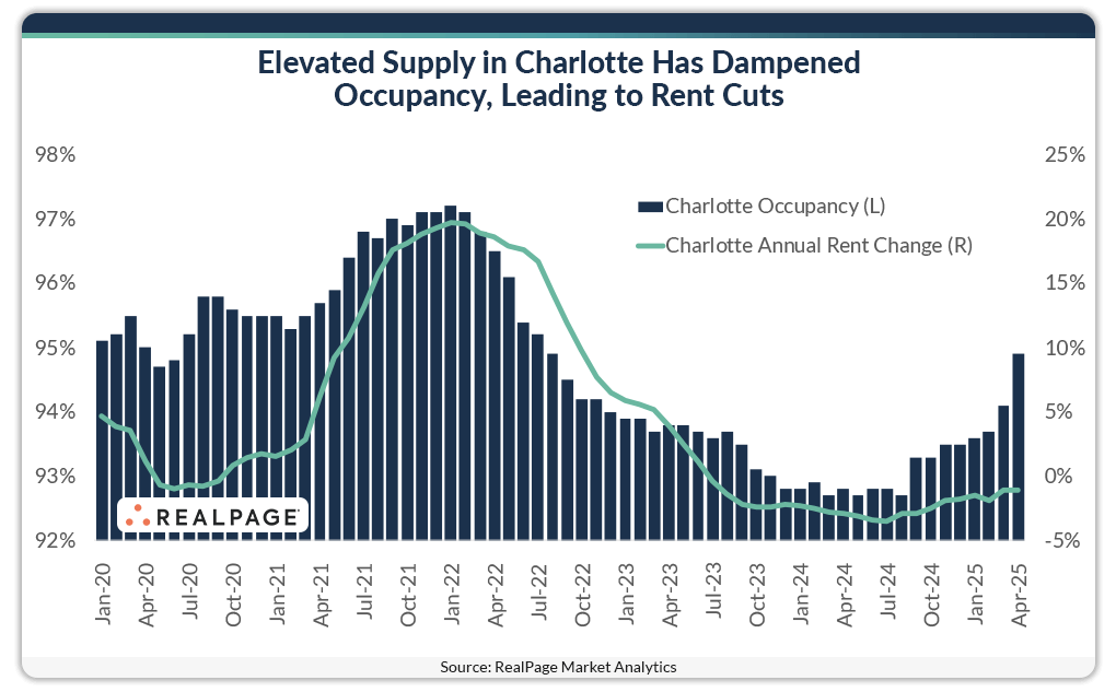 Elevated completions have taken a toll on occupancy in the Charlotte apartment market. Since reaching a high of 97.2% in January 2022, occupancy has fallen below 94% for much of the past two years. However, in April 2025, occupancy increased to 94.9%.
