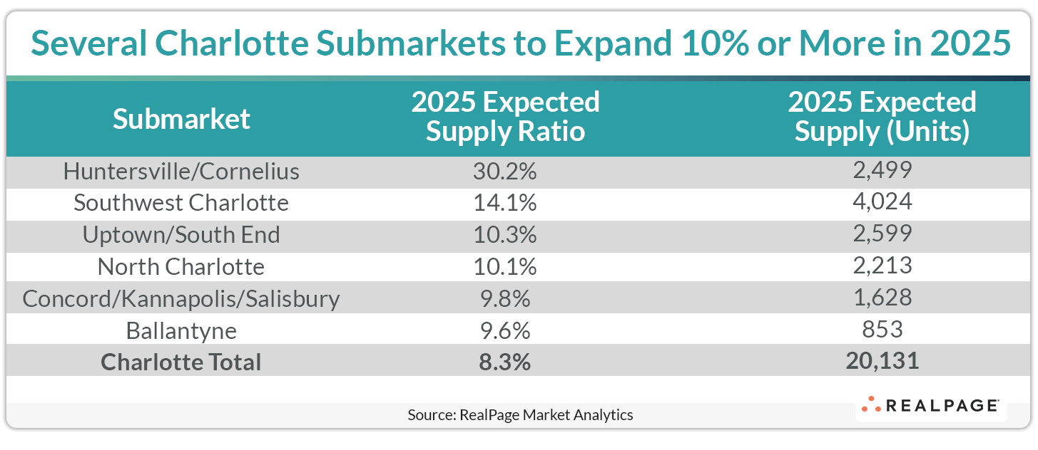 Apartment development continues to push north, as the Charlotte submarket in the spotlight in the near term is Huntersville/Cornelius, which is located just north of the Southwest Charlotte/North Charlotte/UNC Charlotte cluster. Developers are scheduled to wrap up nearly 2,500 units in Huntersville/Cornelius in 2025, which would up the relatively small existing unit base by 30.2%.